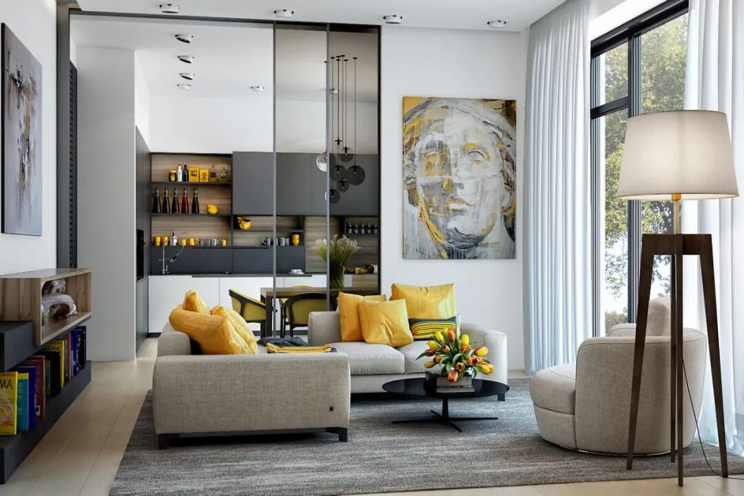 而在灰色為主導(dǎo)的視覺(jué)空間里,一抹亮麗黃鮮活的黃色展現(xiàn)出輕快的活力,活潑跳躍,點(diǎn)綴在空間里,就像是陽(yáng)光、向日葵、玻璃杯里的芒果汁一樣,給人樂(lè)觀(guān)和希望的色彩印象。